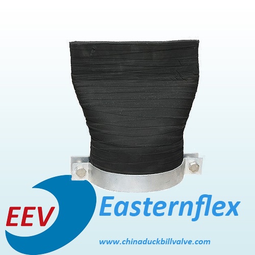 EEV Duckbill check valves are manufactured of flexible rubber material reinforced with fabric material. Its geometry consists of a shot piece of duckbill-like rubber tube at one end, a round flange typically clamped onto a pipe port at the other, and a saddle shape at the middle.